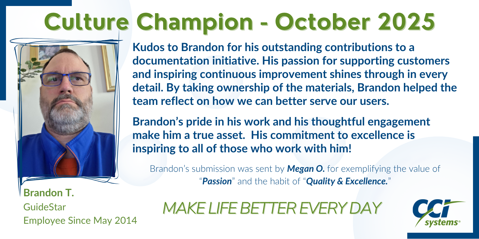 CCI Systems is proud to honor our October 2025 Culture Champion Brandon!