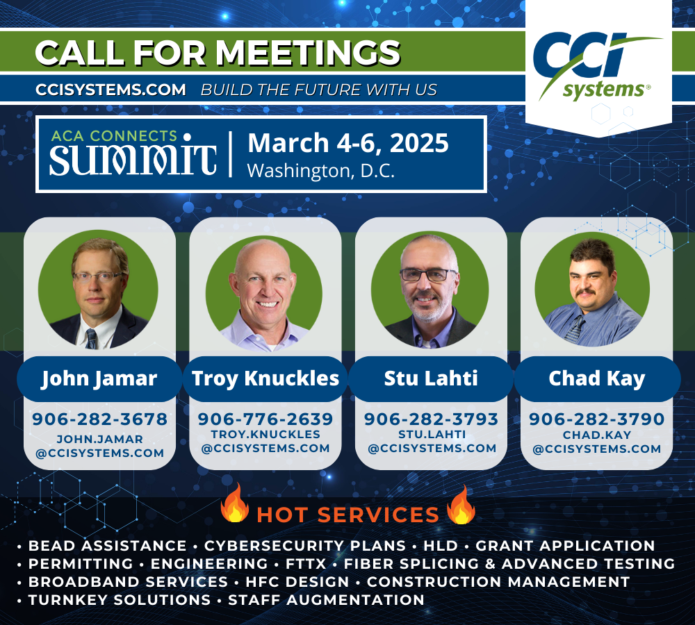 CCI Systems, Inc. a leading provider of consulting, engineering, technical, and sustainability service, will be at ACA Connects Summit 2025 in Washington, D.C. and will be available to meet with your team. We'll discuss how to bring your project vision to reality!