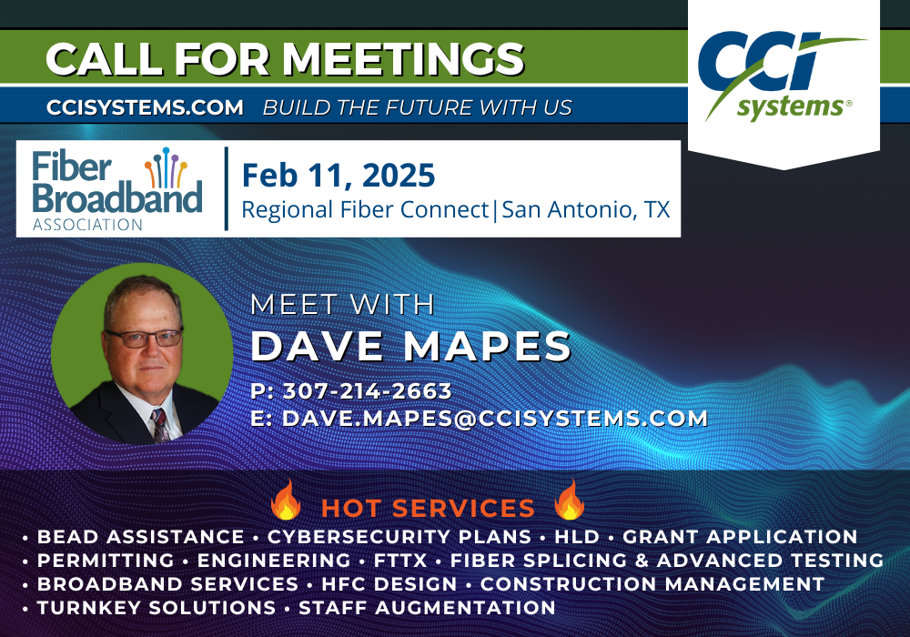 CCI Systems, Inc. a leading provider of consulting, engineering, technical, and sustainability service, will be at 2025 Regional Fiber Connect in San Antonio, TX and will be available to meet with your team. We'll discuss how to bring your broadband vision to reality!