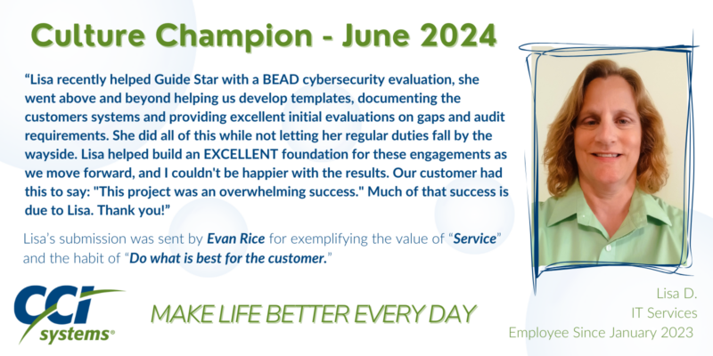 CCI Systems is proud to honor our June 2024 Culture Champion, Lisa D!